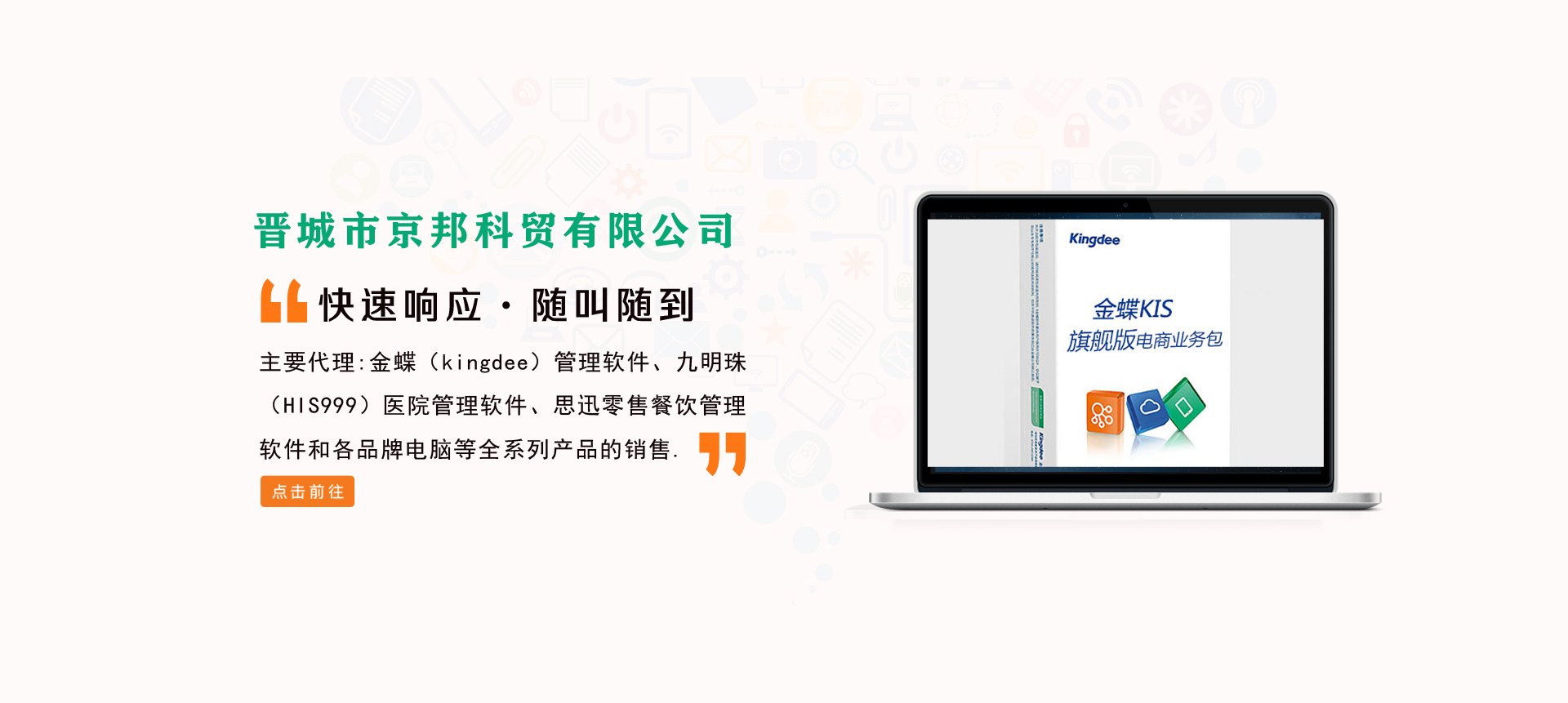 晉城市京邦科貿有限公司成立于2006年,是經晉城市工商行政管理局登記注冊,主要從事軟件銷售、電腦銷售和企業管理咨詢等相關業務,是金蝶軟件(中國)有限公司、深圳九明珠信息科技有限公司、深圳萬國思迅軟件有限公司在晉城地區高級代理商,主要代理金蝶(kingdee)管理軟件、九明珠(HIS999)醫院管理軟件、思迅零售餐飲管理軟件和各品牌電腦等全系列產品的銷售。